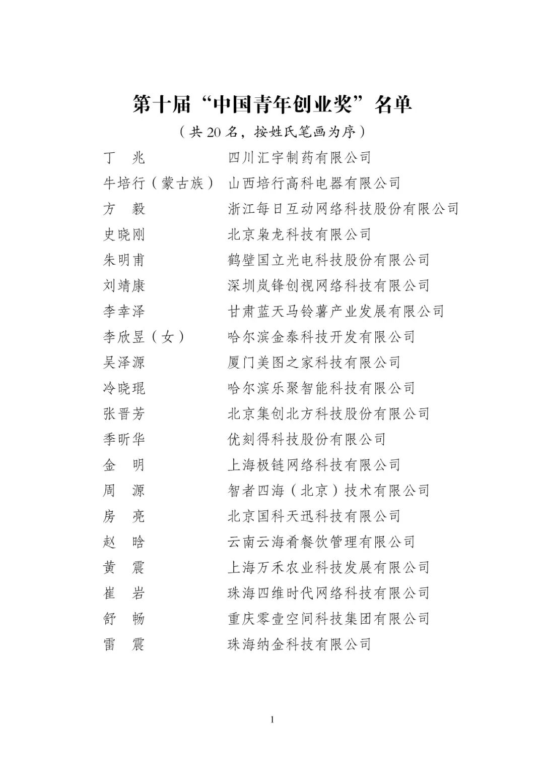 央视财经频道播发第十届“中国青年创业奖”获奖全名单