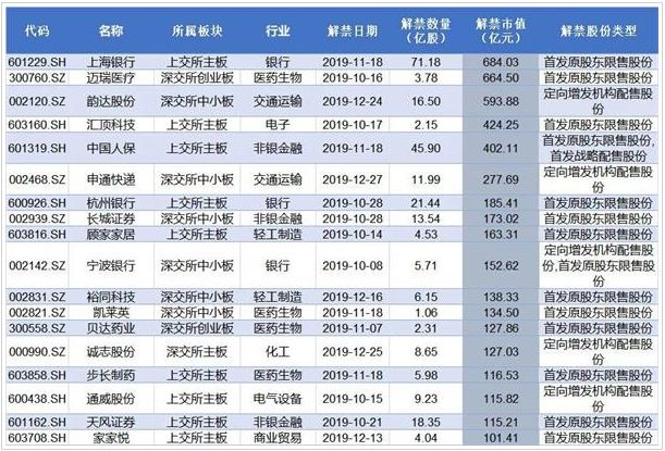 下周还有杭州银行的解禁数量较大。杭州银行本次上市流通的限售股为公司首次公开发行限售股及其转增股份,共计21.44亿股,涉及444名股东,于2019年10月28日上市流通。该公司日前也发布了三季报,前三季度实现营业收入160.47亿元,较上年同期增长25.85%;净利润53.06亿元,较上年同期增长20.25%。