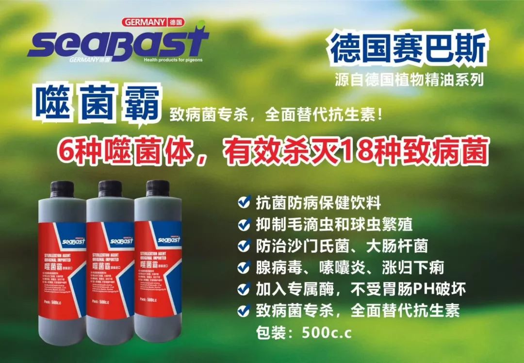 本品萃取德国多种植物精华,辅6种特殊功能噬菌体及抗菌肽,具有高度杀菌力,有效防止沙门氏、腺病毒、嗉囔炎、涨归下痢等疾病的发生,抑制球虫与毛滴虫的繁殖,且能清除毒素,排除肌肉多余代谢物,防止紫胸,清血活肌、保肝祛毒,保持良好飞行状态,提高飞行耐力,是欧洲强豪夺冠之本。