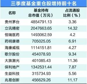 从三季度基金调仓结构看,增持力度较大的是贵州茅台、立讯精密、恒瑞医药,药明康德、海康威视、歌尔股份、大族激光等也获得较多增持。此外,基金三季度对伊利股份、永辉超市、招商银行、新城控股、中国平安、美的集团、洋河股份等减持较多。