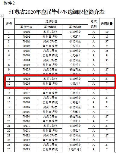 江苏省2020年应届毕业生选调推荐高校名单和职位简介表