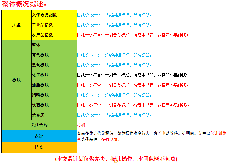 说明:本计划并非预测行情走势,而是以技术面为主,日线级别上寻找高胜率的开仓方向。如果下个交易日走势与计划相符,则可按计划开仓。若走势与计划背离,则观望为主。因为商品品种过多,并不一一列举。未罗列的品种,表明技术面上并非板块内最适合开仓的品种。
