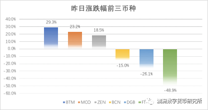 3. 24小时行情市值排名前百币种中涨幅前三为:BTM(+29.3%)、MCO(+23.2%)、ZEN(+18.5%);市值前百币种跌幅前三为:FT(-48.9%)、DGB(-26.1%)、BCN(-15.0%)。