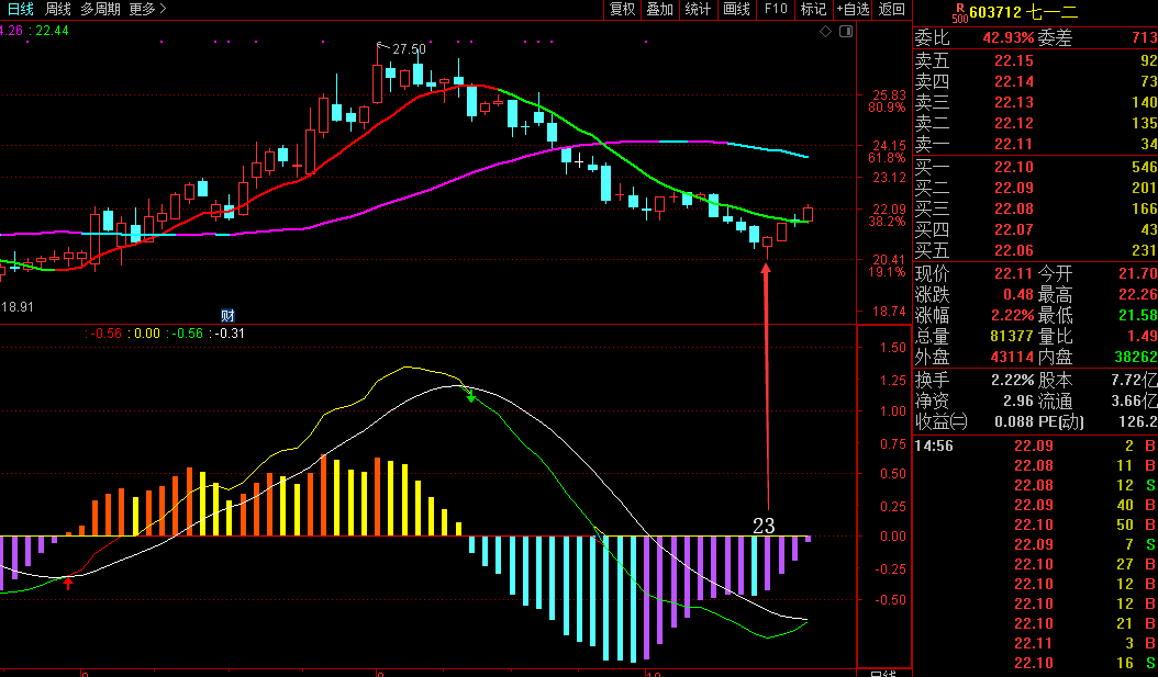 3、七一二(603712),该股今天日线级别运行至第26根,转折性买点在第23根处,今日不符合转折点买入条件。