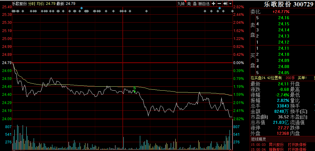 2、乐歌股份今日卖出,整体微利2.4%左右。