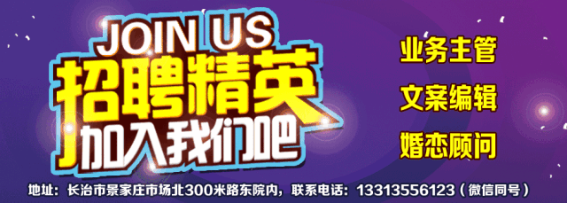 ▼ 【招聘】长治市星启点文化传媒有限公司 诚聘:婚礼策划。具体要求:热爱婚礼行业;具有较好审美意识;有较强的沟通能力及交际技巧;具有亲和力;有工作经验者优先。薪资待遇:底薪+提成(具体面议)(联系电话:18335588222)