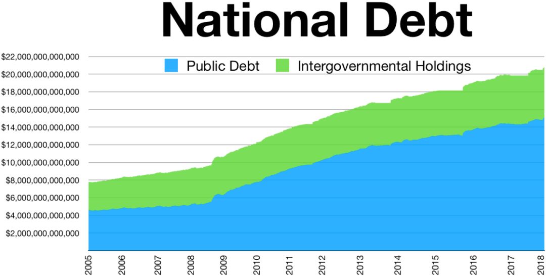 美国国债目前已到22.7万亿美元的规模,2018年的GDP则为20.5万亿美元