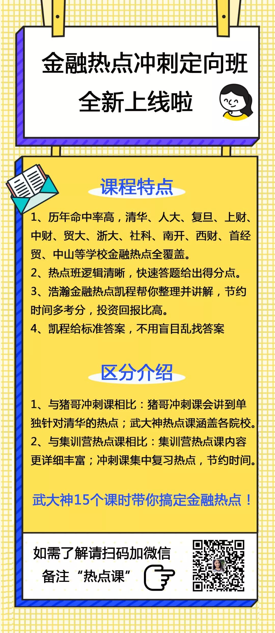 我们全新推出的金融热点冲刺课程,由武老师主讲,武老师被同学们称为“武大神”,清华五道口硕士博士双状元,多年辅导经验,热点精准把握,深受学员喜爱,凯程独家授课老师,听过课的都说好!