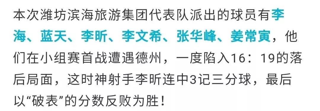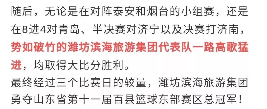 10月27日,山东省第十一届百县篮球东部赛区总决赛(东部赛区)的比赛全部结束,潍坊滨海旅游集团代表队过关斩将,最终战胜诸多强手,获得赛事东部赛区的总冠军。