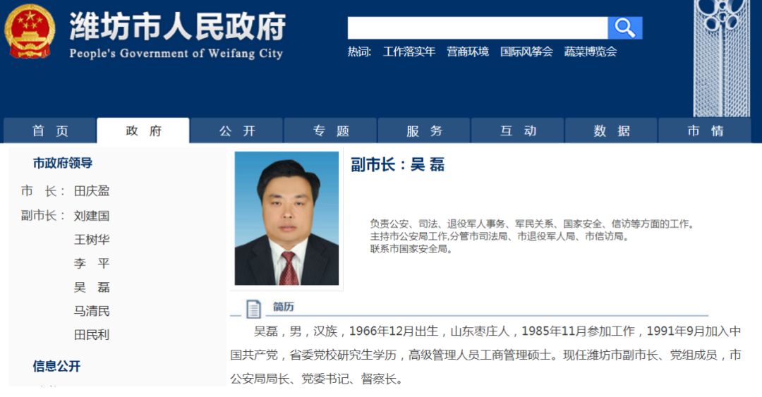 潍坊市政府网站的公开信息显示,“吴磊,男,汉族,1966年12月出生,山东枣庄人,1985年11月参加工作,1991年9月加入中国共产党,省委党校研究生学历,高级管理人员工商管理硕士。现任潍坊市副市长、党组成员,市公安局局长、党委书记、督察长。”其副市长的分工为负责公安、司法、退役军人事务、军民关系、国家安全、信访等方面的工作;主持市公安局工作,分管市司法局、市退役军人局、市信访局;联系市国家安全局。