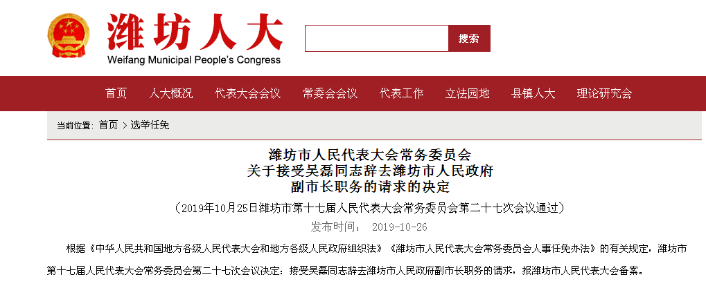 10月26日,潍坊市人民代表大会常务委员会发布关于接受吴磊同志辞去潍坊市人民政府副市长职务的请求的决定:根据《中华人民共和国地方各级人民代表大会和地方各级人民政府组织法》《潍坊市人民代表大会常务委员会人事任免办法》的有关规定,潍坊市第十七届人民代表大会常务委员会第二十七次会议决定:接受吴磊同志辞去潍坊市人民政府副市长职务的请求,报潍坊市人民代表大会备案。