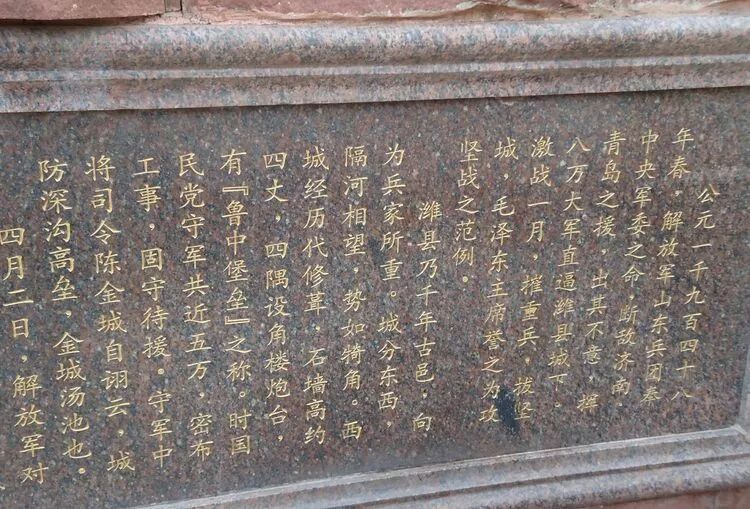 在潍坊市内亚星桥北白浪河西岸,竖立一泰山原石。旁边一石上,由曾经参加过潍县战役的原中央军委副主席、国务委员兼国防部部长迟浩田将军亲题“潍县战役胜利纪念”八字。背后是潍坊市政协原副主席王庆德撰写的潍县战役记文。泰山原石高11.5米,宽4.5米,厚1.7米,重138吨,象征着革命先烈重如泰山的精神和坚贞不屈的高尚情操。