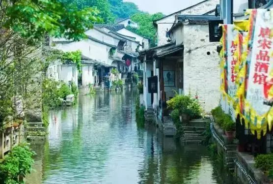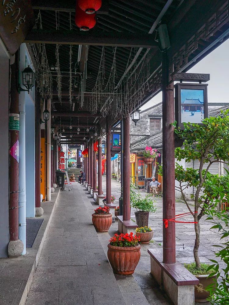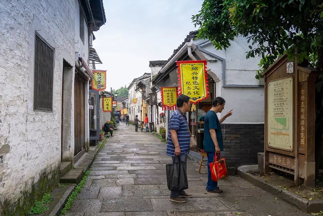 沿街酒肆、茶楼、店铺旗幡招展,嵌有花窗的白墙,满堂棕漆的排门屋,青石为门枋的石库台门,花格门窗的仿古木楼,展现了绍兴传统街巷的特色。