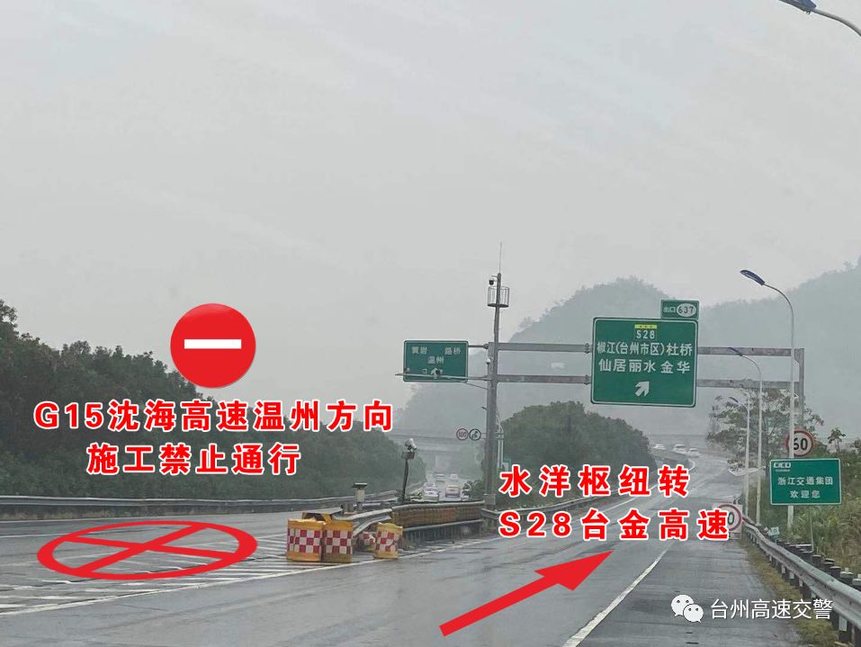 ▼S28台金高速公路水洋枢纽转G15沈海高速公路福建方向禁止通行。