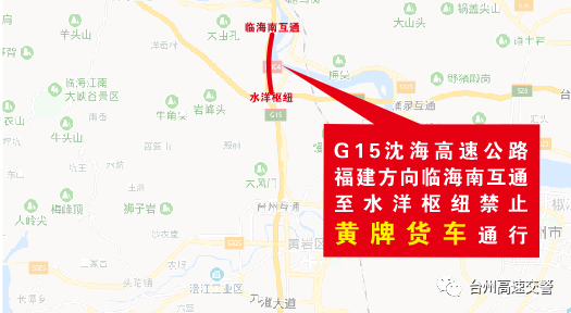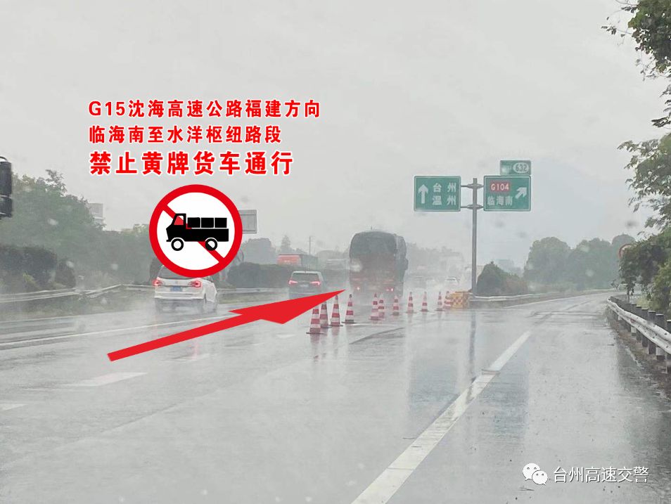 ▼G15沈海高速公路福建方向临海南至水洋枢纽路段禁止黄牌货车通行,其他车辆经S28台金高速公路绕行G1523甬莞高速公路。
