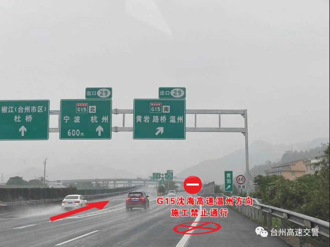 ▼G15沈海高速公路福建方向水洋枢纽至温岭西路段禁止通行。