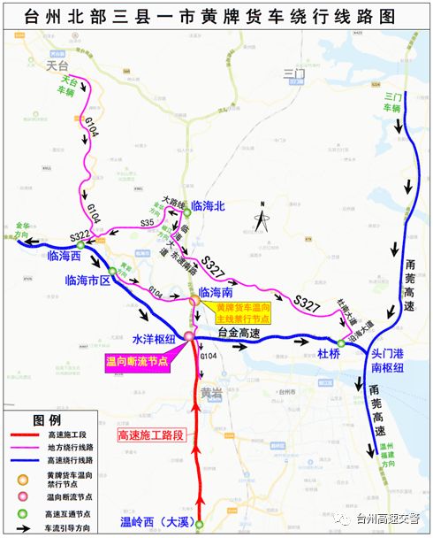 台州市三区车辆绕行线路1、黄岩车辆走G104国道,从温岭西上高速,施工第九天后,即11月6日,可从台州南上高速。2、椒江、路桥车辆从G1523甬莞高速通行。