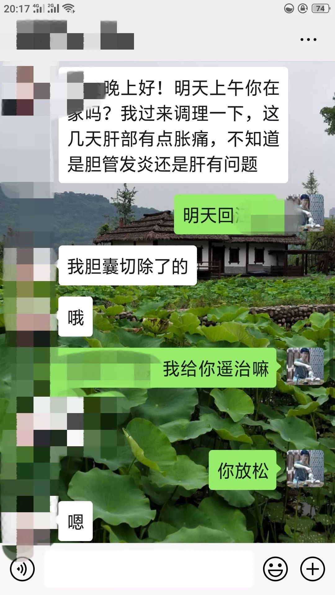 附:上古医弟子叶师兄治疗案例患者,女,57岁,近几天肝区胀痛(胆囊曾切除),本来准备第二天找叶师兄调理。叶师兄当即为她遥治,1分钟,就感觉轻松多了;5分钟,不痛了,还有点胀;10分钟,不胀了,还放屁(排浊气)。详见下图: << 左右滑动查看下一张图片 >>