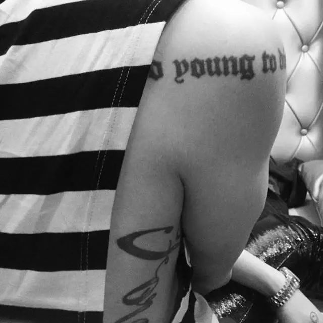还有背后纹身:Too fast to live too young to die,过于仓促的生活会使自己过于年轻就逝去。用慢一点的速度才能好好去享受生活。