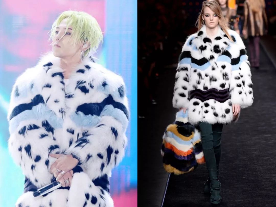 现在男明星们开始大肆穿女装的潮流可以说就是GD开启的。好多年前,无论是舞台上还是日常街拍,都可以看到权志龙用女装演绎的跨性别穿搭。比如这件颇具贵妇感的斑点印花皮草,配合张扬的娃娃菜发色,一下就打破了皮草给人的老气感。