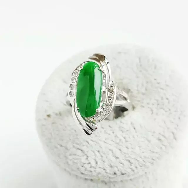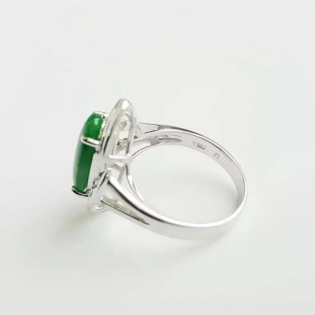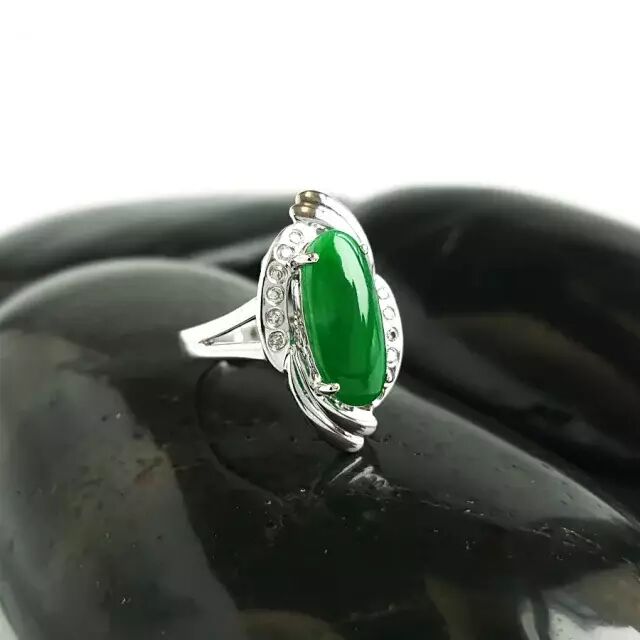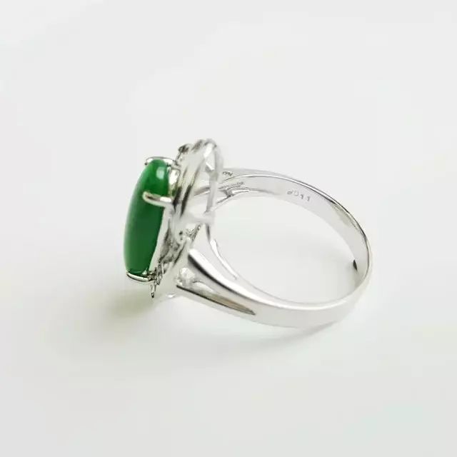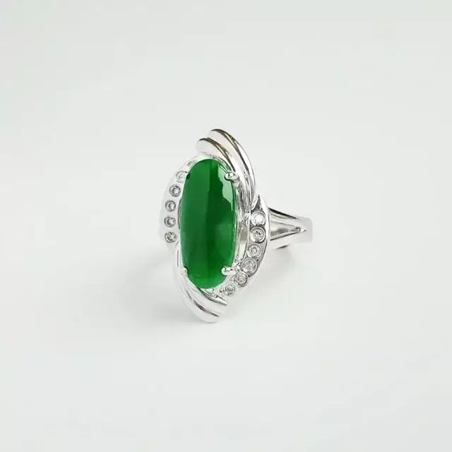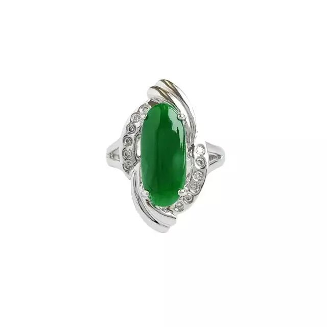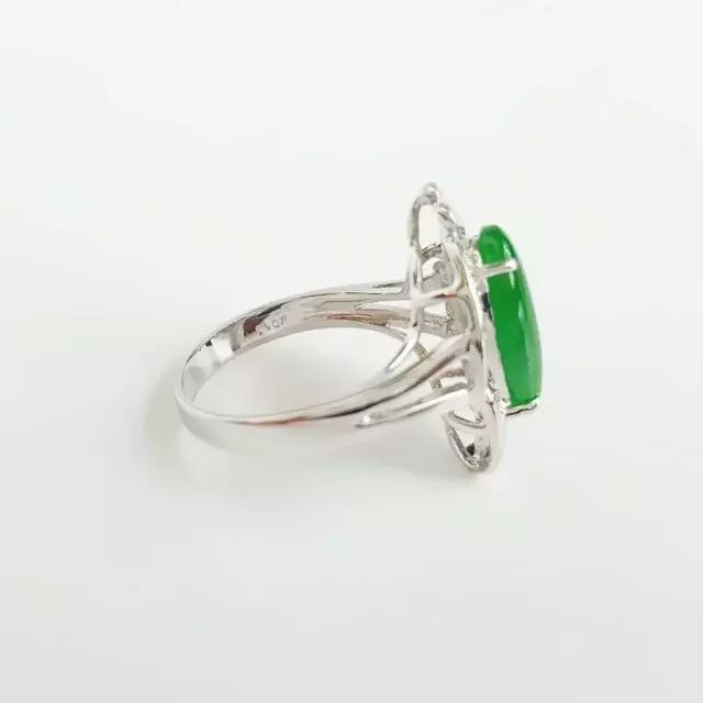 天然A货18K镶钻白金椭圆正阳绿翡翠16号戒指