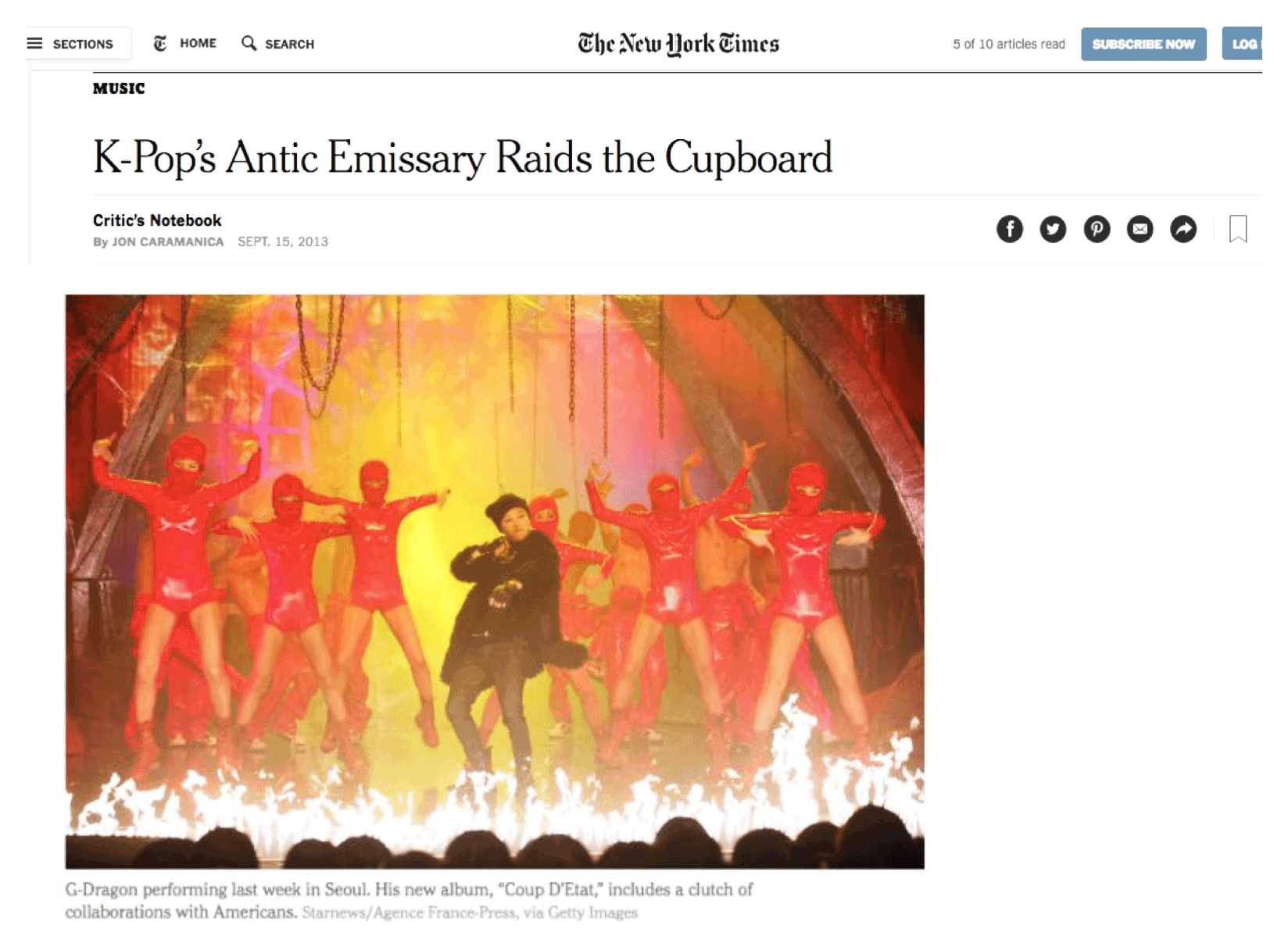 GD作为首位美国BILLBOARD榜单上出现的韩国歌手,同时也被《纽约时报》评价:“模仿美国流行音乐的K-POP时代将会过去,全世界都会向权志龙学习。”音乐才华已经走出泡菜国,飞往世界了!