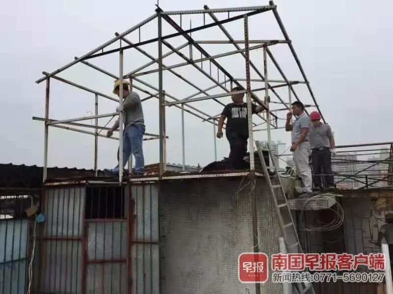 位于南宁市高峰路96号新峰大厦,有人在楼顶违法搭建了20多间简易房。有人租来居住,也有人用于仓储。10月26日,执法部门对这一违建群进行了强制拆除。