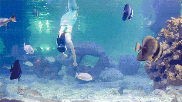 你以为大洋池的亮点这就完了!太out了!此处怎么能少得了美人鱼表演呢!美人鱼表演者们,将为我们献上一曲动人的人鱼之舞!