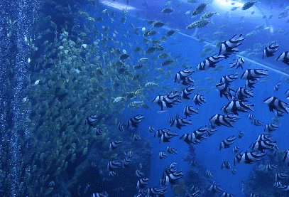 大洋池从负1层直达负2层的大洋池,可谓相当的壮观。无数的鱼类成群结队的在这里游动着,密密麻麻,却又井然有序。