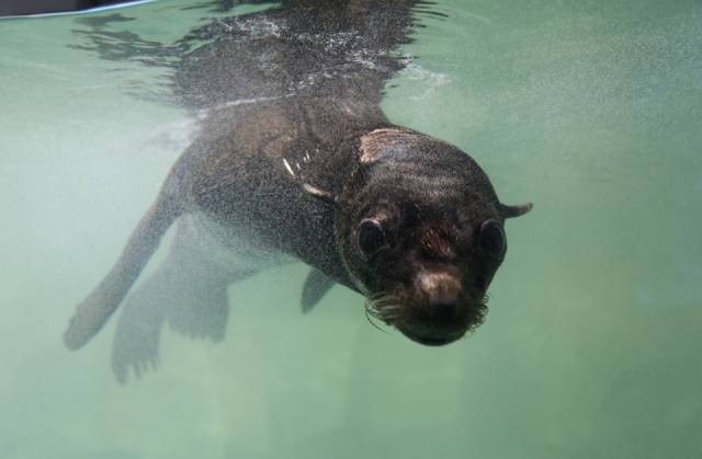 聪明可爱,性情温和的海狮,寿命可达20年以上。小指头般大的小耳朵很是可爱。小编到的时候,它正在水里转着圈圈玩耍。