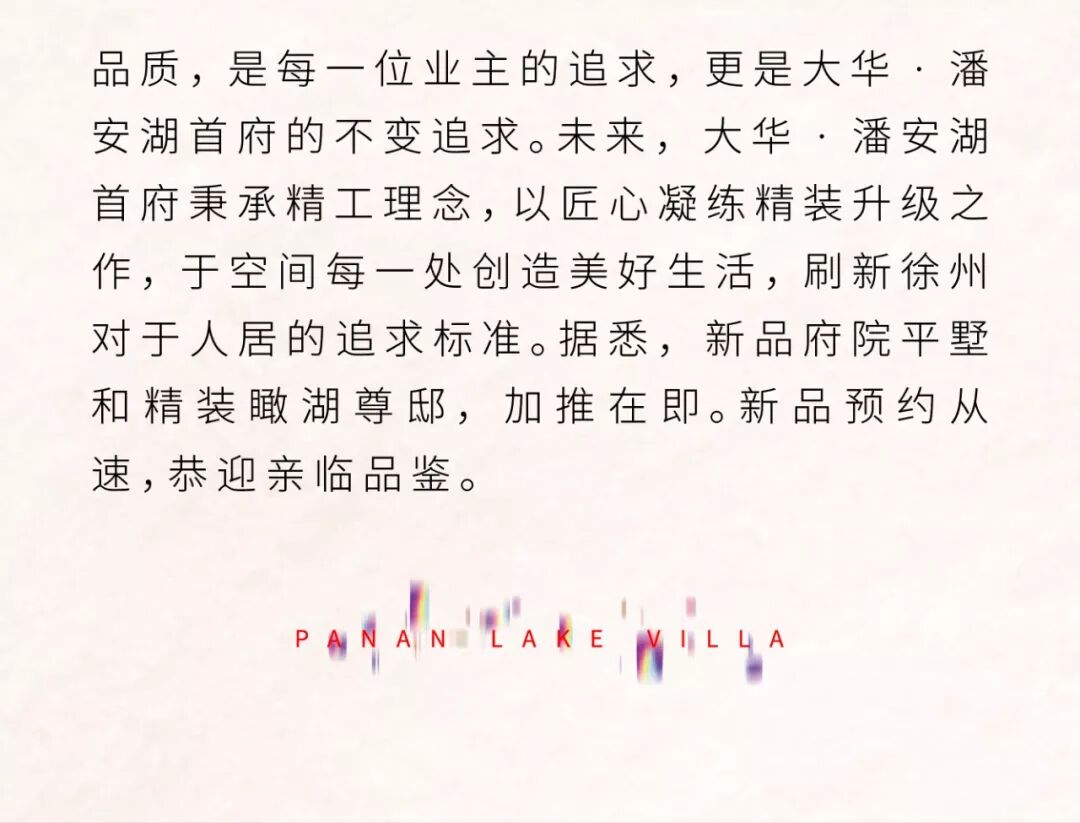 项目推广名:大华·潘安湖首府 项目备案名(一期):大华潘安湖首府璞院 预售证号:贾房售许字(2019)第71号 贾房售许字(2019)第76号 本资料为要约邀请,相关内容不排除因政府相关规划、规定及开发商未能控制的原因而发生变化。本公司保留对宣传资料修改的权利,敬请留意最新资料。项目介绍,旨在提供相关信息,不意味本公司对此作出承诺,买卖双方的权利义务以合同约定为准。