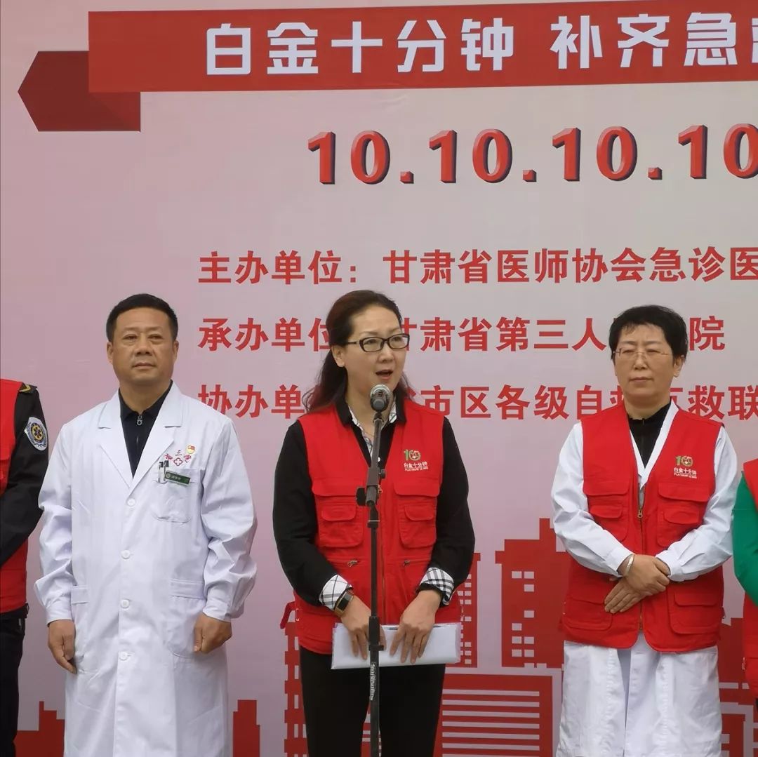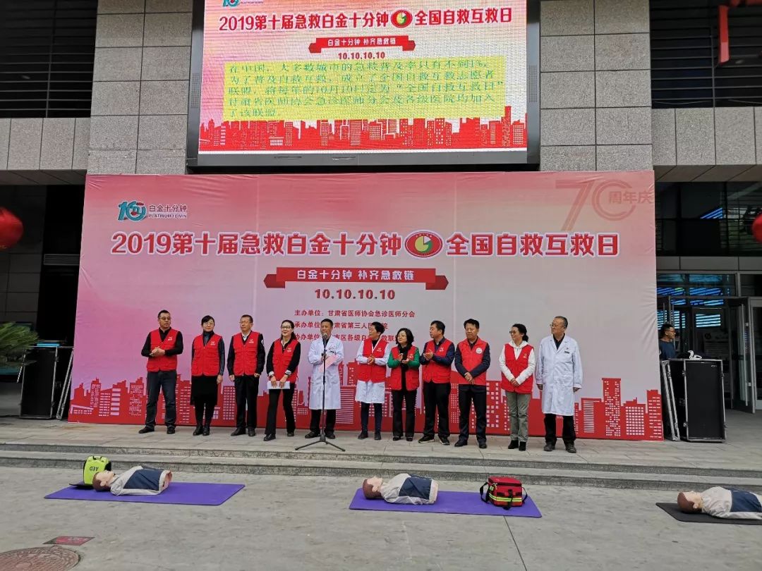 每年的10月10日为白金十分钟“自救互救日”。根据白金十分钟全国自救互救志愿服务联盟的宗旨和任务,2019年第十届“急救白金十分钟全国自救互救日”于2019年10月10日10点10分在全国举办。按照全国自救互救志愿服务联盟及急诊医师分会部署,由甘肃省医师协会急诊医师分会、全国自救互救志愿服务联盟、甘肃省老年医学会老年急诊专业委员会、甘肃省老年医学会老年创伤专业委员会,甘肃省老年医学会老年全科专业委员会共同主办,甘肃省第三人民医院承办,甘肃省医师协会乡村医师分会及省市各级医院共同协办的大型急救科普宣传活动于2019年10月10日在甘肃省第三人民医院顺利举办。