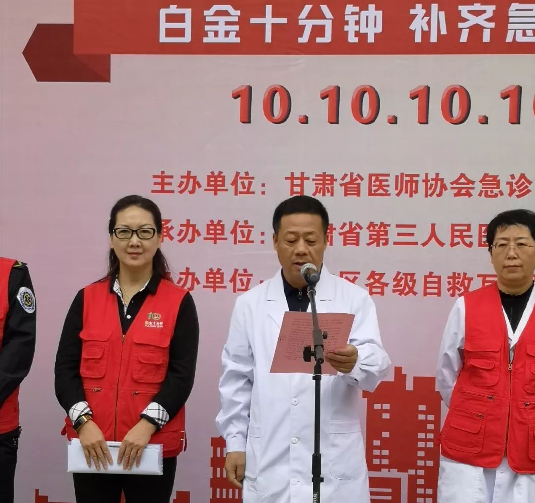 甘肃省第三人民医院郭豫学院长在开幕式上致辞,对前来参加活动的医师协会急诊分会的联盟专家团队及群众表示欢迎及感谢,指出国内猝死的现状不容乐观,“白金十分钟”急救新理念是一切伤病救治的开始和基础,做好白金十分钟,补齐了“大众自救互救—120专业现场救护和转运—医院救治—功能康复”急救链,能够护佑意外伤病者进入专科中心,从而为患者后续的抢救争得先机。