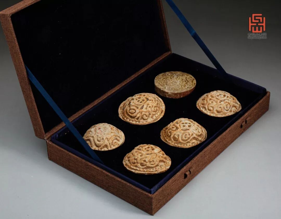 藏品说明: 汉朝在我国历史上是一个大国,物产丰富,资源众多。此青瓷铭文币也是汉代之物,属原始青瓷,共有六枚。一枚饼状,面略鼓起,模印卷草纹饰。另五枚馒头形,模印纹饰。六枚青瓷铭币均施青釉,釉层极薄。底微凹,一枚划刻“千万”,四枚划刻“百万”,饼形状的划刻“黄金二?”。这批青瓷铭币,可联想到西汉海昏侯墓出土的马蹄金。马蹄金是西汉皇帝给诸侯王的赏赐品,相当于今天的纪念币。这些青瓷铭文币的主人,应当是贵族,以皇家诸侯的规格,伴其终生。
