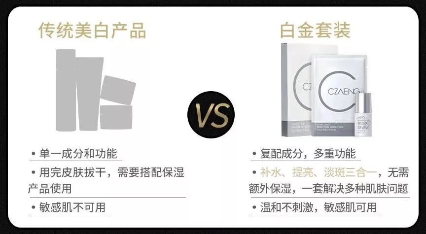不查不知道,原来白金套装采用的是独有的复合成分!可以完美兼具美白、祛斑、补水等多项美肤技能!吊打传统单一成分产品