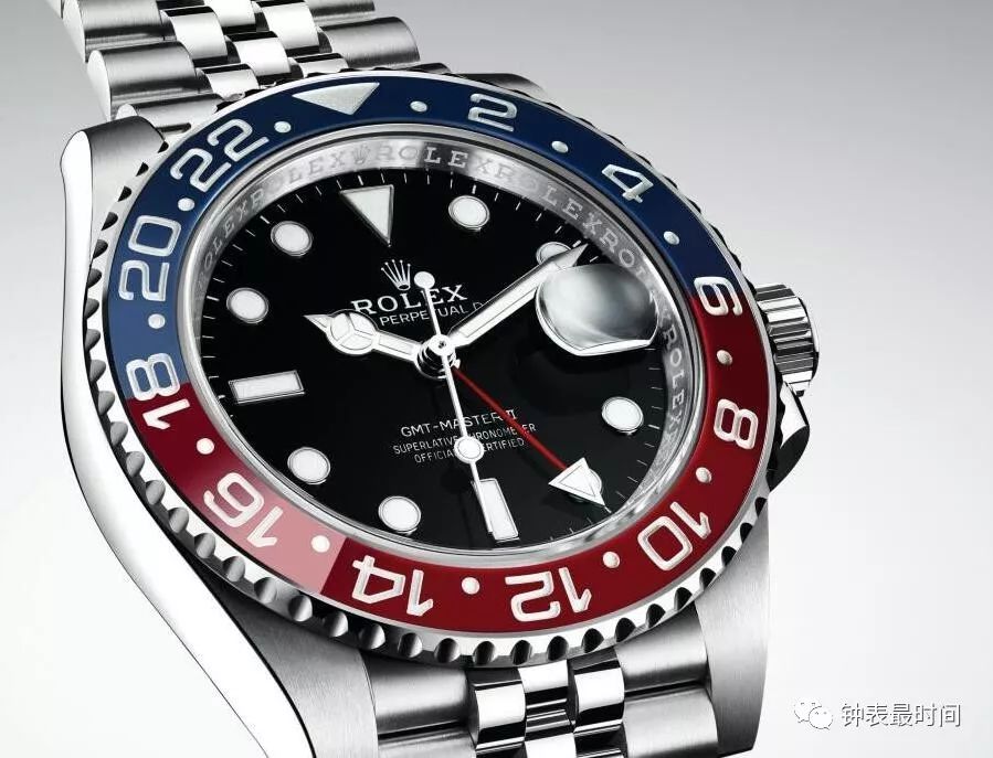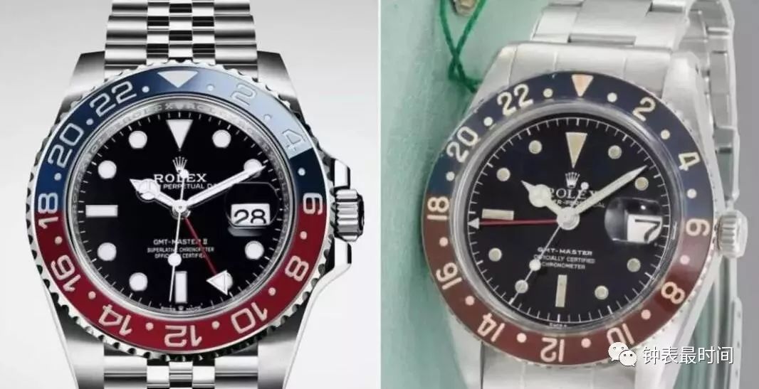劳力士的GMT-Master向来很受欢迎,它有着类似水鬼Submariner的外型,又兼具实用的两地时间功能,劳力士GMT-Master II出现双色陶瓷技术更是推进了这一风潮的流行。GMT-Master自1955年首次推出以来,虽然整体设计风格变化不大,但在表圈的演变和更新下这款表让许多表迷们有了玩赏的兴趣。最初的GMT-Master采用红、蓝双色24小时制表圈设计,不过当时受限于材料技术的颜值,是运用先上色再改树脂玻璃的方式,以强化表圈的视觉立体感。
