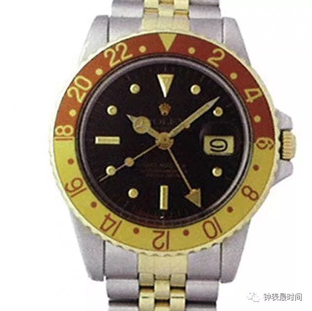 除了经典的"百事"表圈配色,劳力士于GMT-Master腕表也尝试搭配不同色系组合,如七十年代这只精钢+黄金表身便具有棕、金双色表圈。
